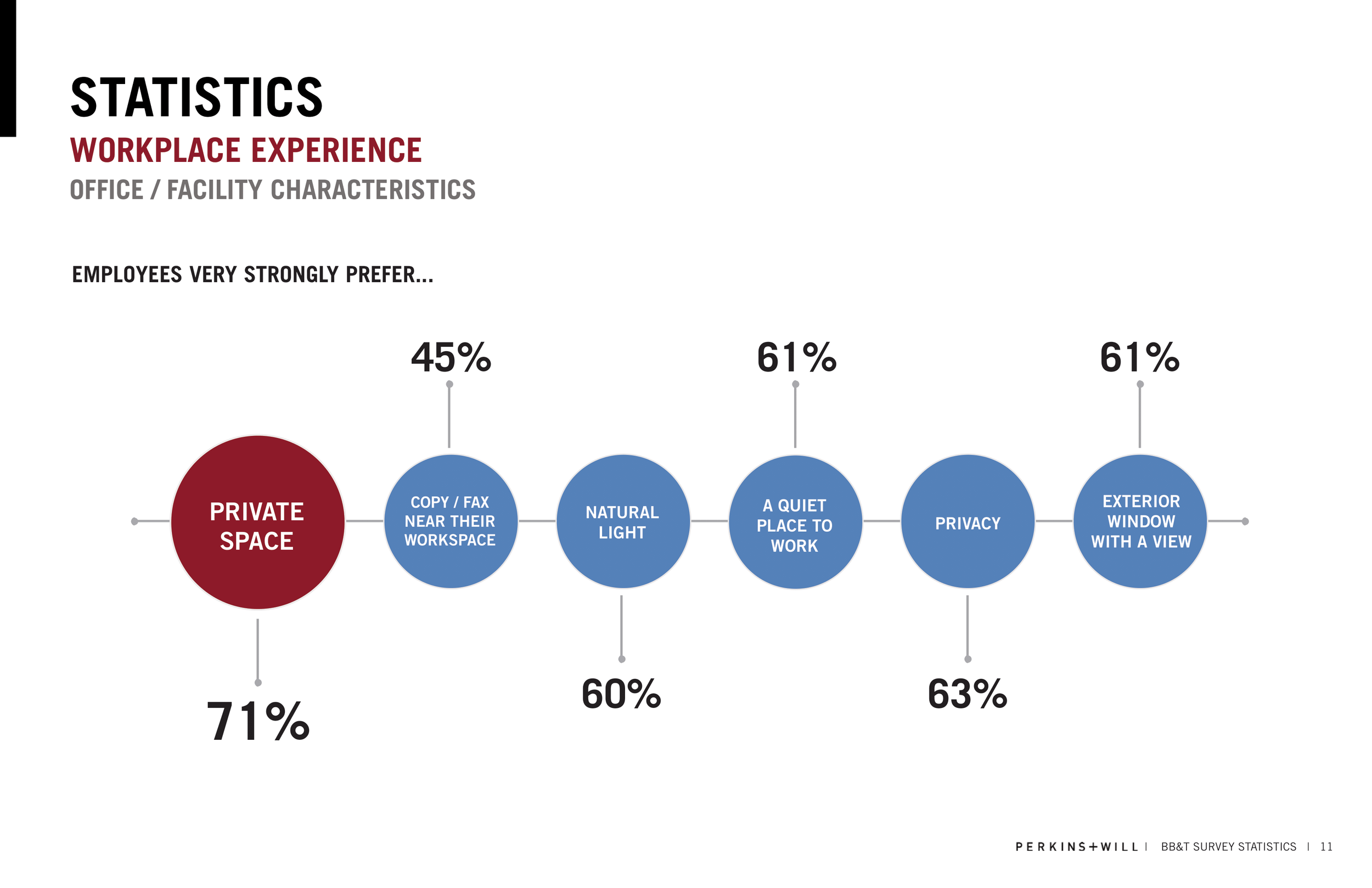Identified top workplace preferences, including privacy, natural light, and quiet areas, highlighting the need to balance individual focus spaces with more energizing communal zones